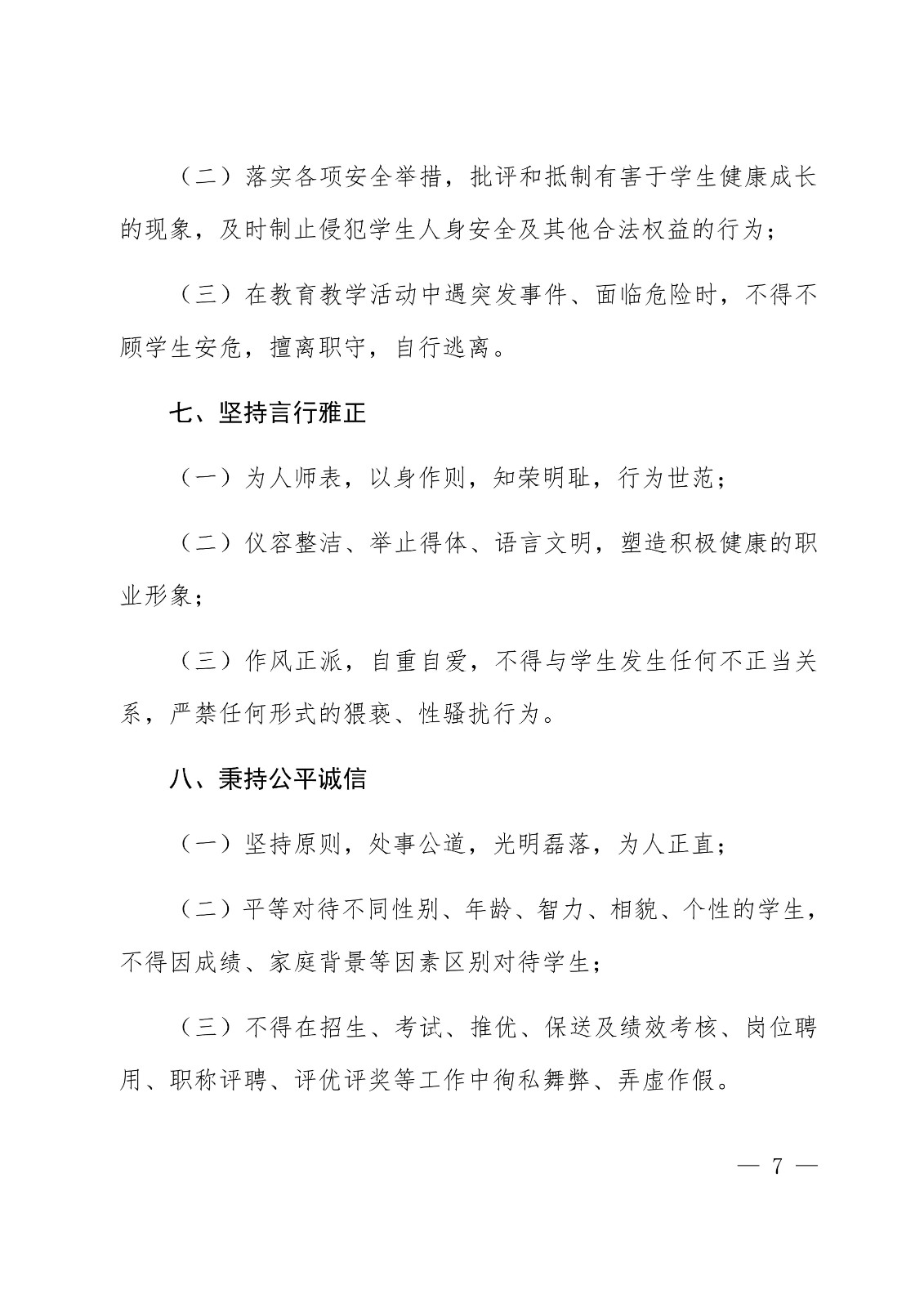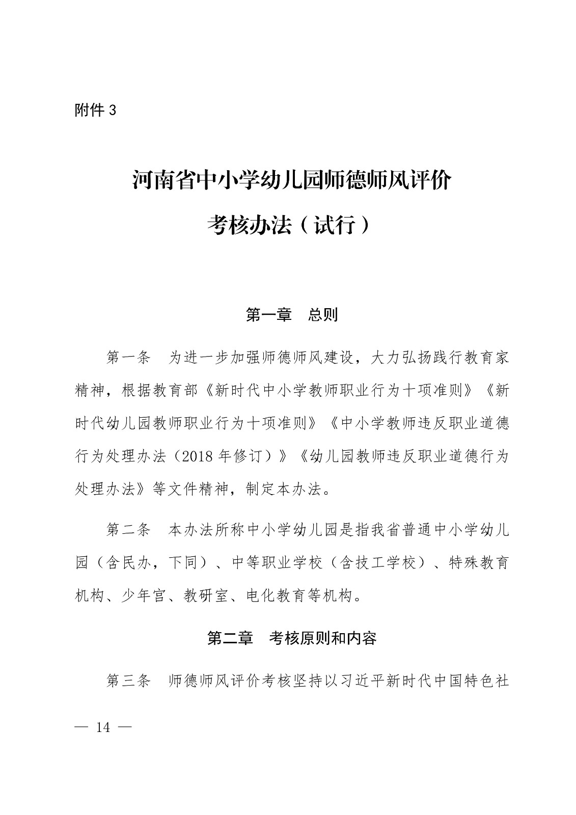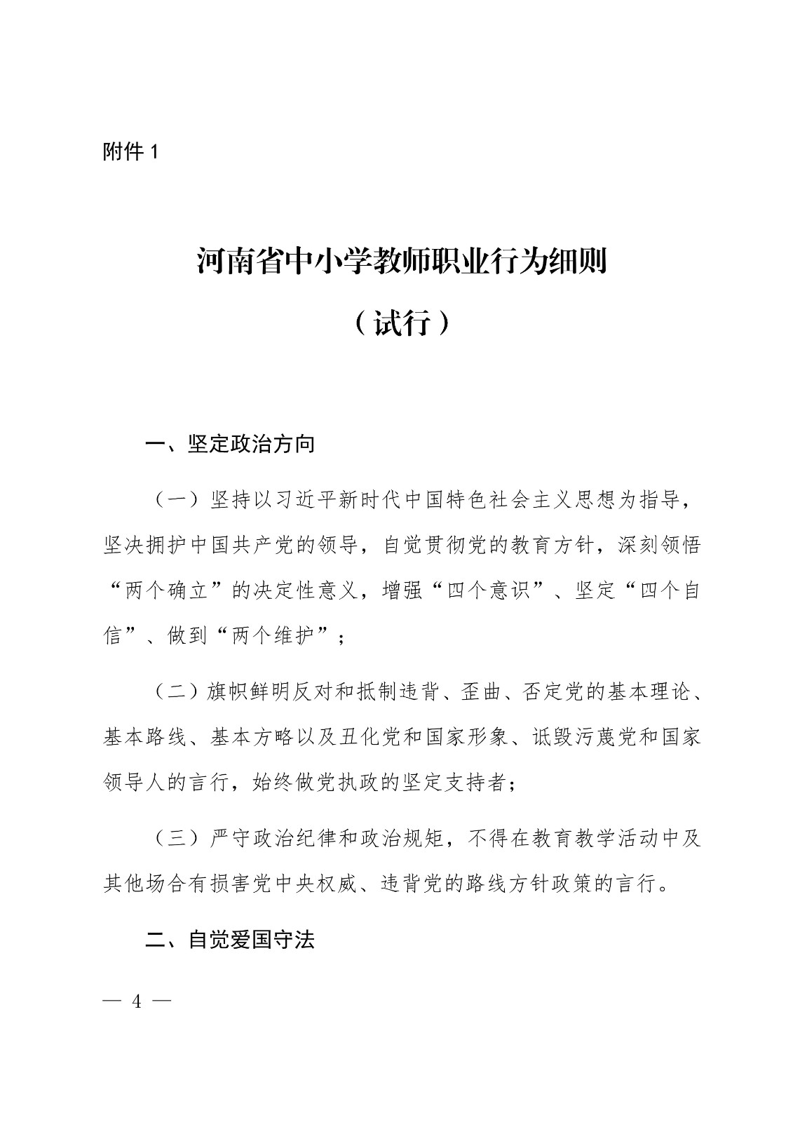 为深入贯彻落实《教育强国建设规划纲要(2024-2035年)》和《中共中央 国务院关于弘扬教育家精神加强新时代高素质专业化教师队伍建设的意见》,健全新时代师德师风建设长效机制,结合我省教师队伍建设实际,省教育厅制定《河南省中小学教师职业行为细则(试行)》等文件。现印发给你们,请认真贯彻执行。