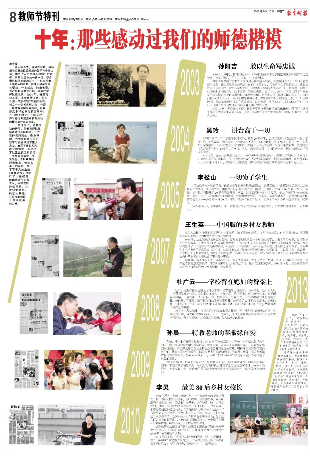 做了多年的教育媒体记者,我深知在当时的全国第一人口大省的教育战线上,有着无数精神感天动地、事迹可歌可泣的人物。除了在报纸上以文字和图片塑造他们的典型形象,我们不也可以通过类似的活动,进一步放大他们的形象、彰显他们的精神吗?这与教育时报提出要做“中原教育崛起发言人”是同样的思路。