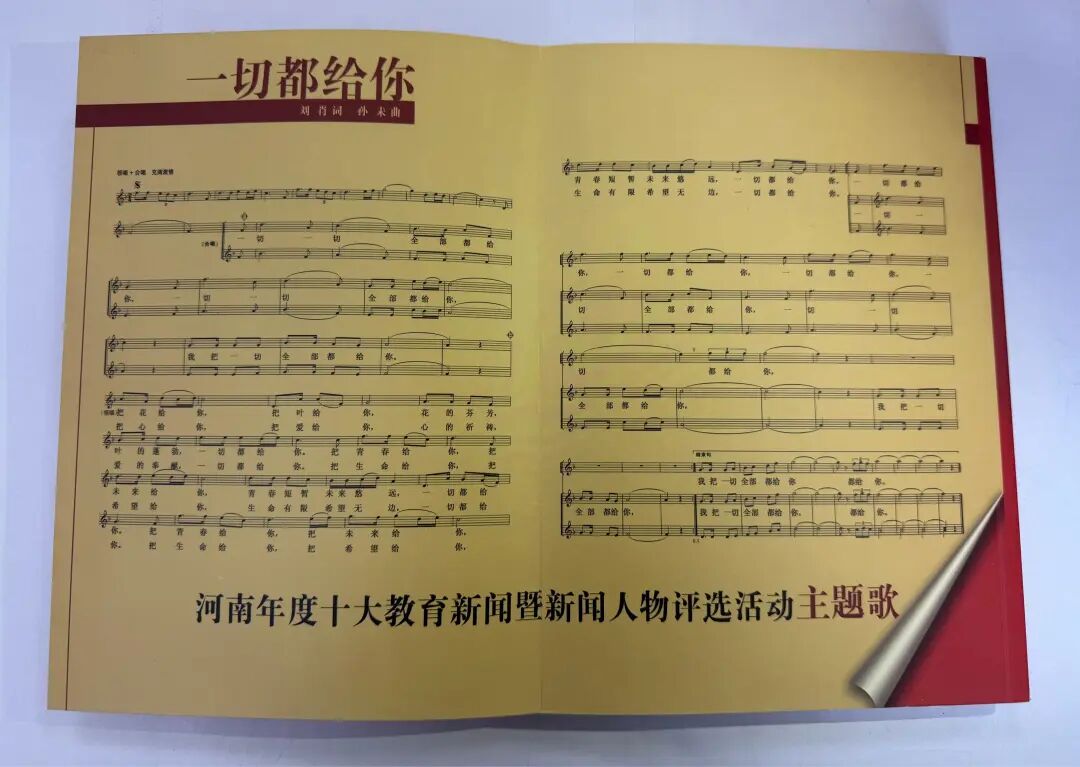 不久,以首届河南教育新闻人物宣传活动全记录为主题的全彩印图书,由河南人民出版社盛装推出,书名就是——《一切都给你》。活动主题歌《一切都给你》以拉页的形式,被炫目地印在书的封底,也将一段动人的旋律永远地印在教育宣传的进程中。
