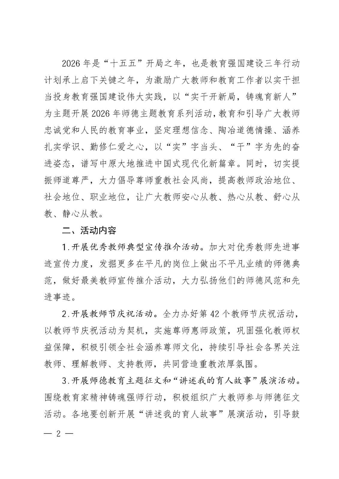 2026年是“十五五”开局之年,也是教育强国建设三年行动计划承上启下关键之年,为激励广大教师和教育工作者以实干担当投身教育强国建设伟大实践,以“实干开新局,铸魂育新人”为主题开展2026年师德主题教育系列活动,教育和引导广大教师忠诚党和人民的教育事业,坚定理想信念、陶冶道德情操、涵养扎实学识、勤修仁爱之心,以“实”字当头、“干”字为先的奋进姿态,谱写中原大地推进中国式现代化新篇章。同时,切实提振师道尊严,大力倡导尊师重教社会风尚,提高教师政治地位、社会地位、职业地位,让广大教师安心从教、热心从教、舒心从教、静心从教。