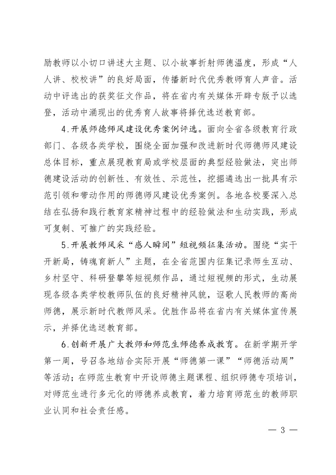 6.创新开展广大教师和师范生师德养成教育。在新学期开学第一周,号召各地结合实际开展“师德第一课”“师德活动周”等活动;在师范生教育中开设师德主题课程、组织师德专项培训,对师范生进行多元化的师德养成教育,着力培育师范生的教师职业认同和社会责任感。
