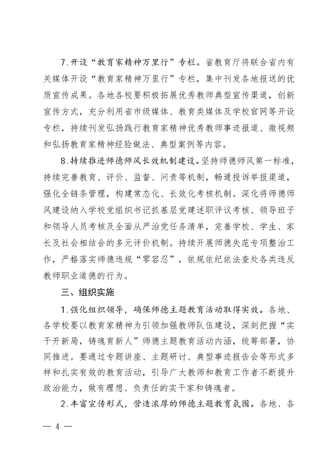 1.强化组织领导,确保师德主题教育活动取得实效。各地、各学校要以教育家精神为引领加强教师队伍建设,深刻把握“实干开新局,铸魂育新人”师德主题教育活动内涵,统筹部署,协同推进。要通过专题讲座、主题研讨、典型事迹报告会等形式多样和扎实有效的教育活动,引导广大教师和教育工作者不断提升政治能力,做有理想、负责任的实干家和铸魂者。
