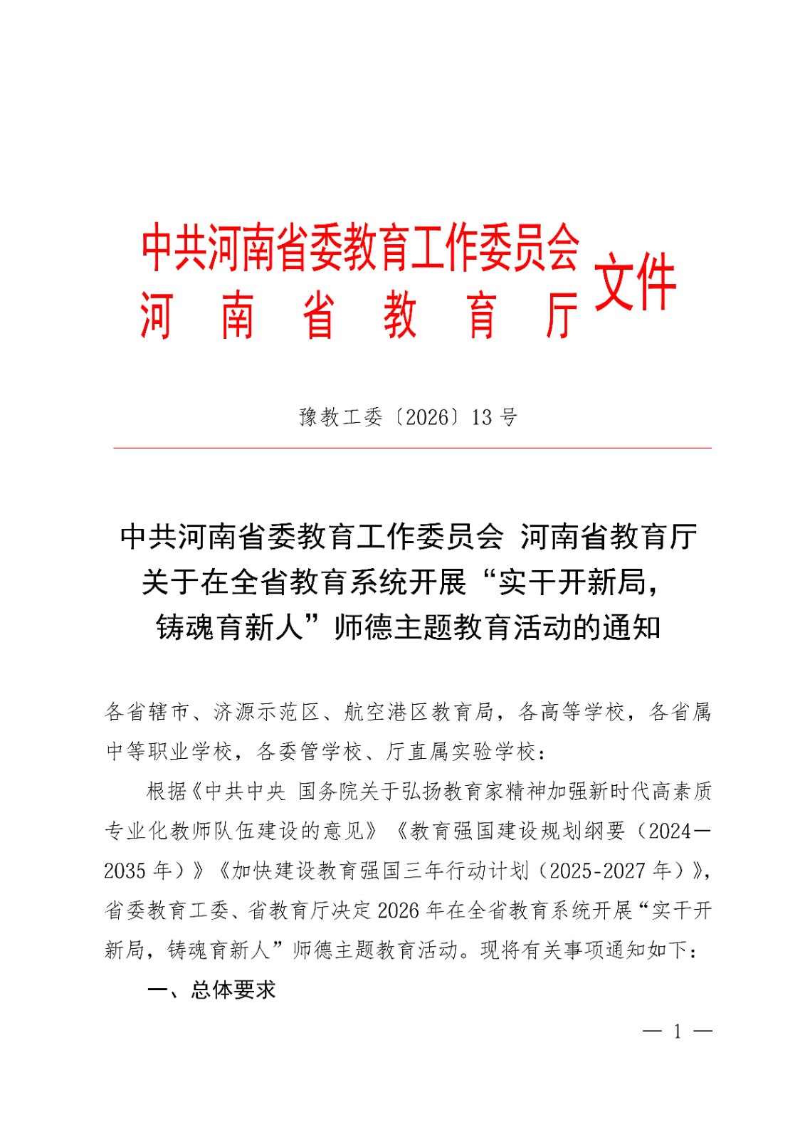 根据《中共中央 国务院关于弘扬教育家精神加强新时代高素质专业化教师队伍建设的意见》《教育强国建设规划纲要(2024-2035年)》《加快建设教育强国三年行动计划(2025-2027年)》,省委教育工委、省教育厅决定2026年在全省教育系统开展“实干开新局,铸魂育新人”师德主题教育活动。现将有关事项通知如下:
